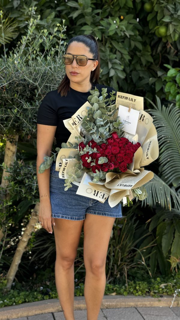 זר 50 ורדים אדומים בתוספת אקליפטוס
